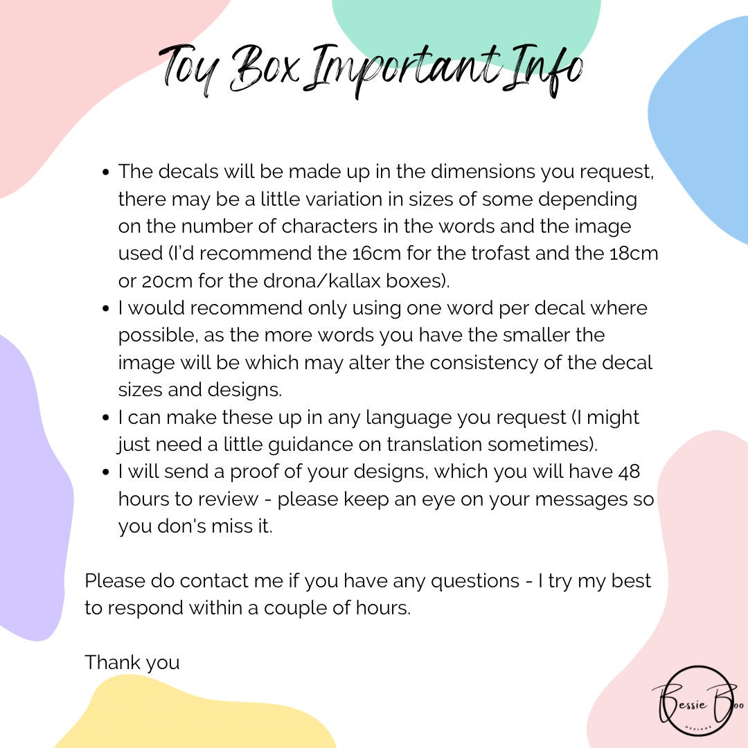 Custom-made Vinyl Transfer Labels to fit any toy storage unit or system you have (with a smooth surface - please note they will not adhere to canvas or fabric with a textured surface).