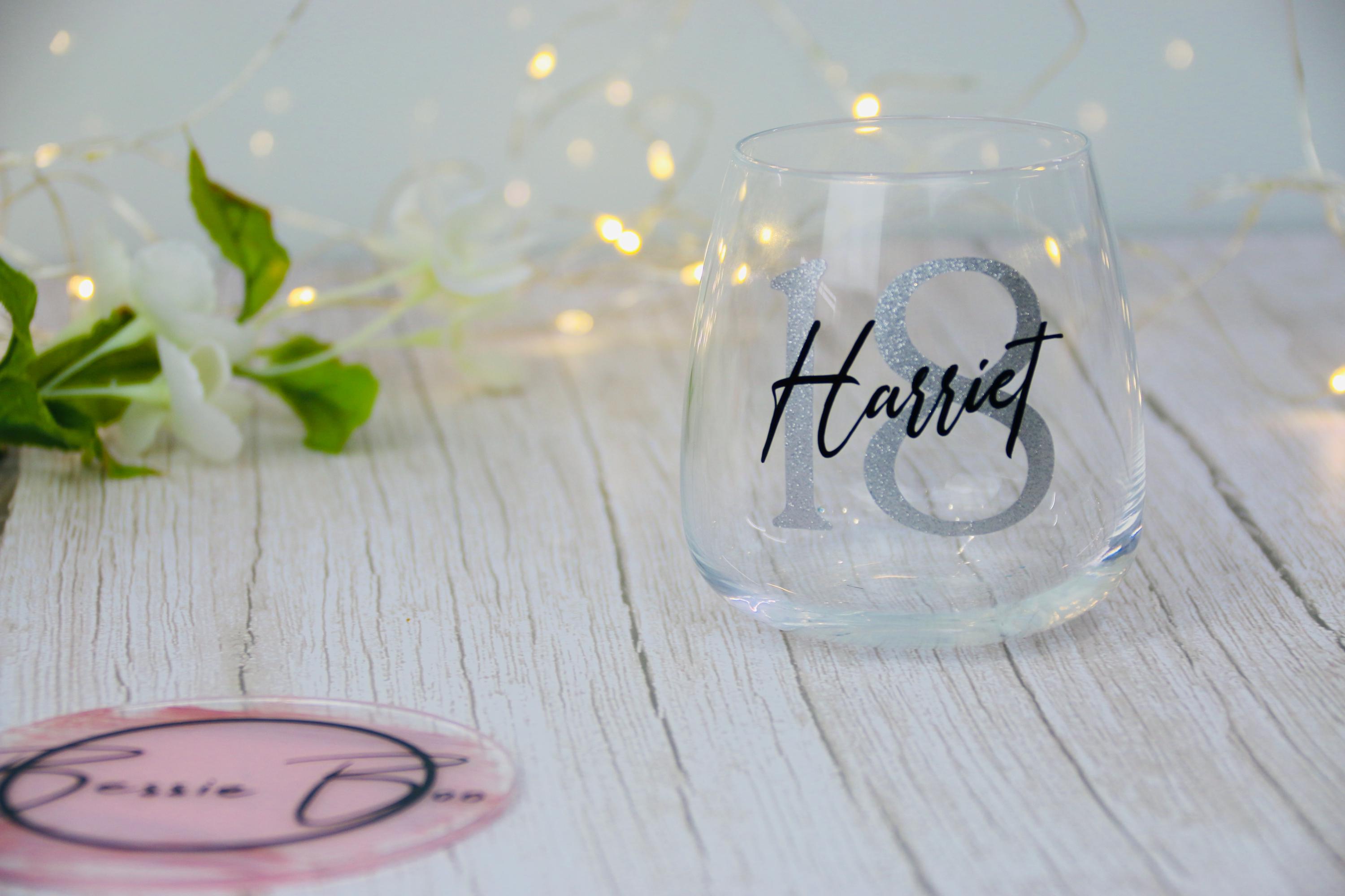 Choose between a glass tumbler, mug, pint glass, wine glass, gin glass or latte mug, beautifully personalised with handmade vinyl decal made in a your chosen colour.