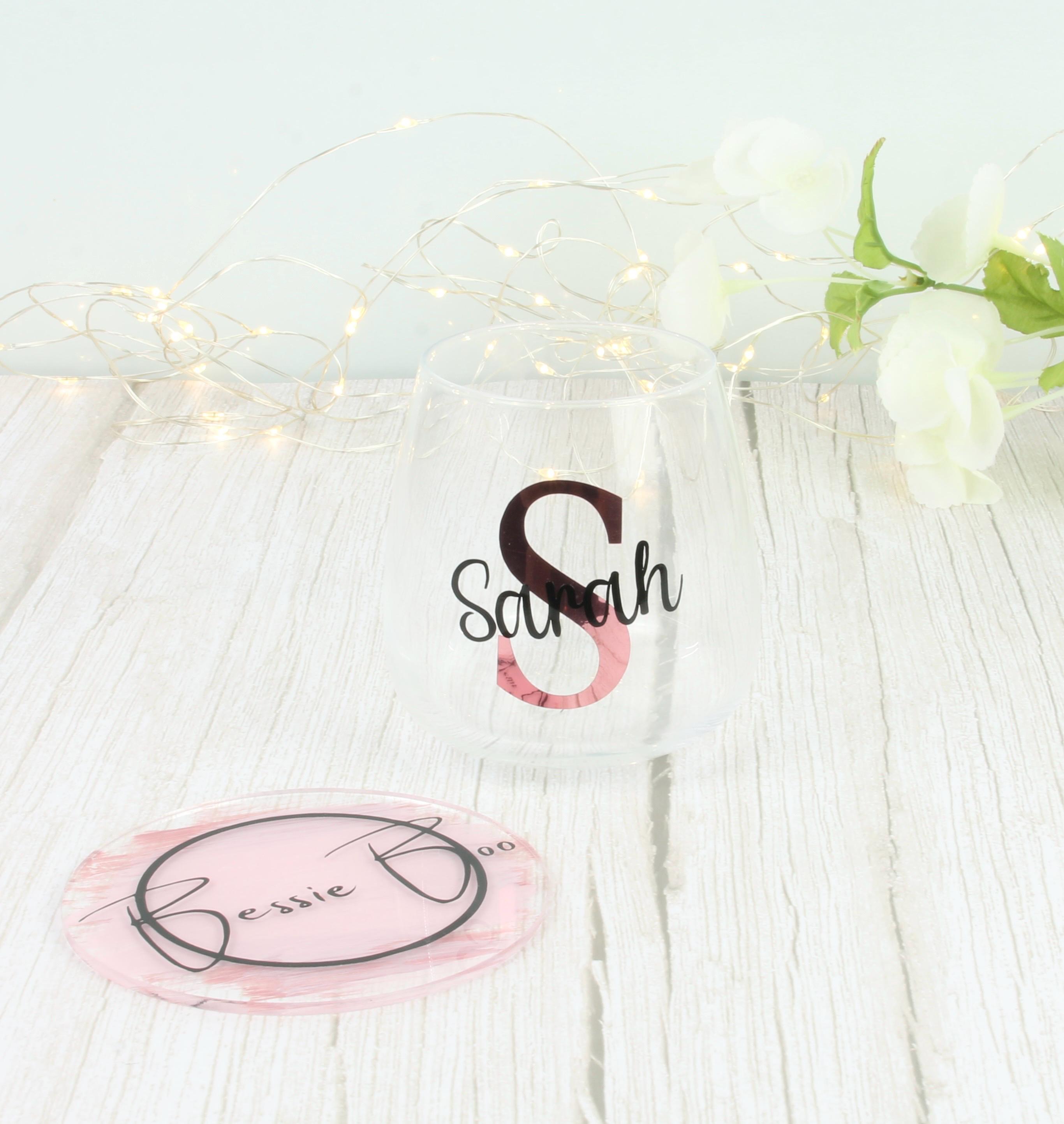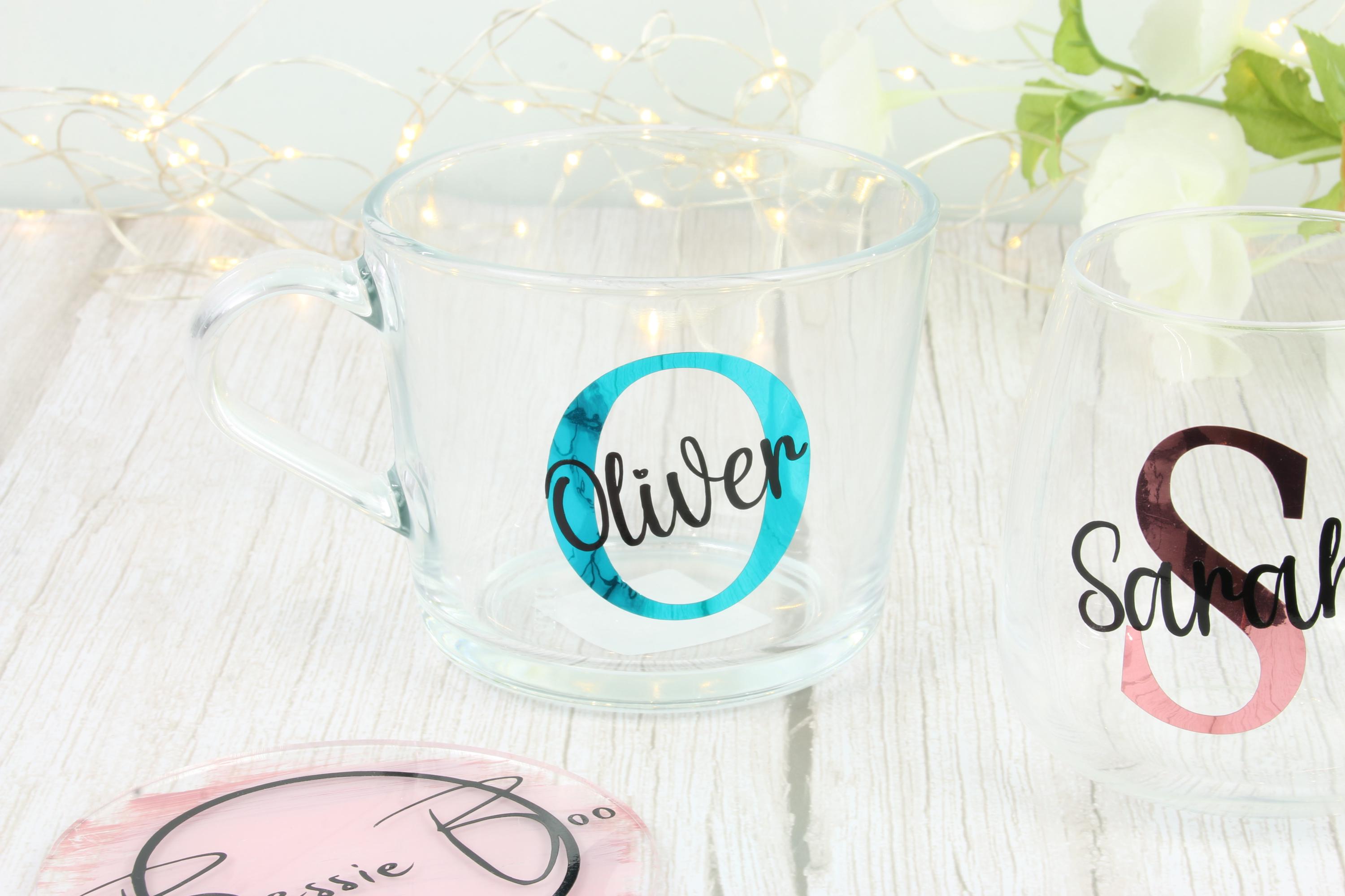 Choose between a glass tumbler, mug, pint glass, wine glass, gin glass or latte mug, beautifully personalised with handmade vinyl decal made in a your chosen colour.