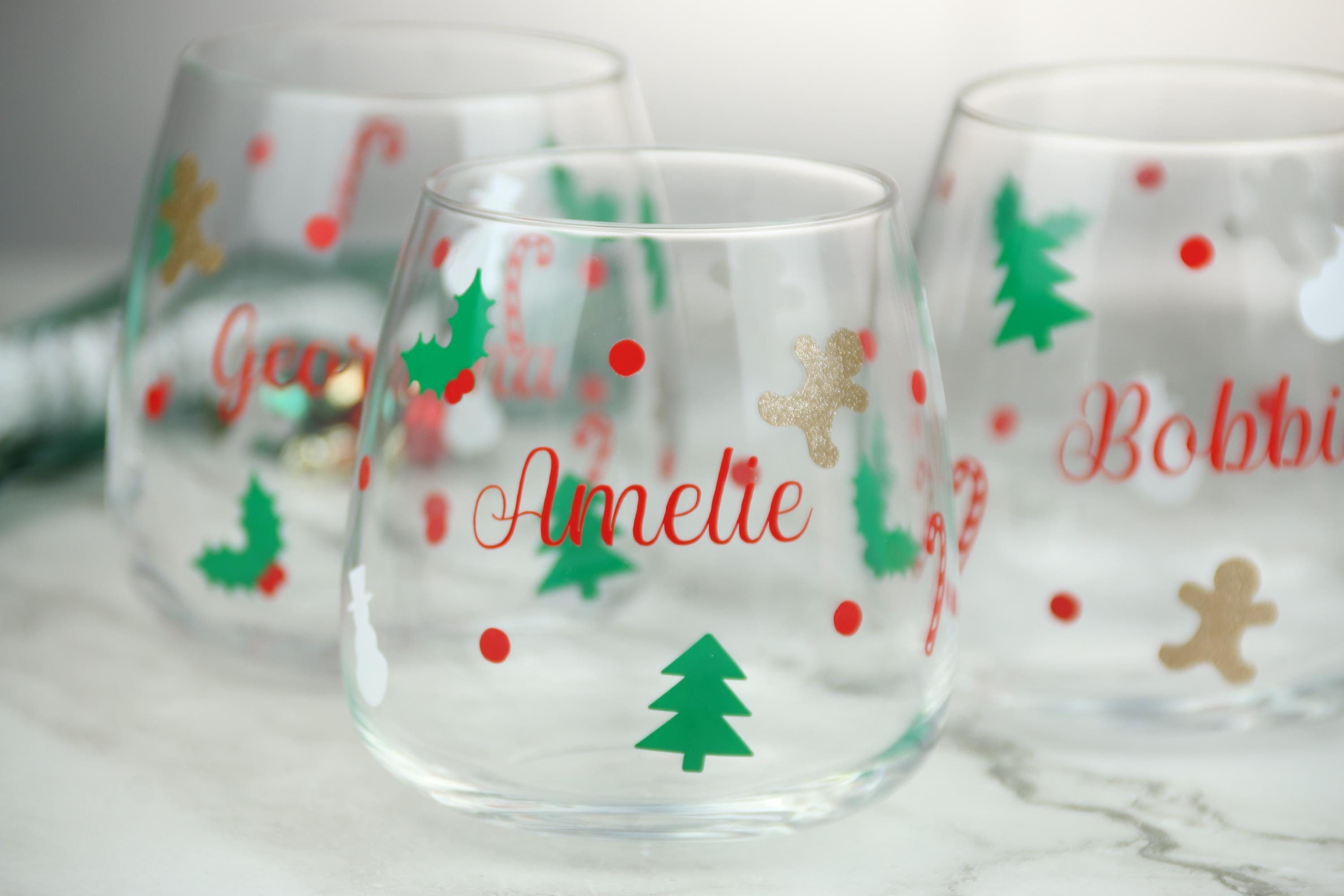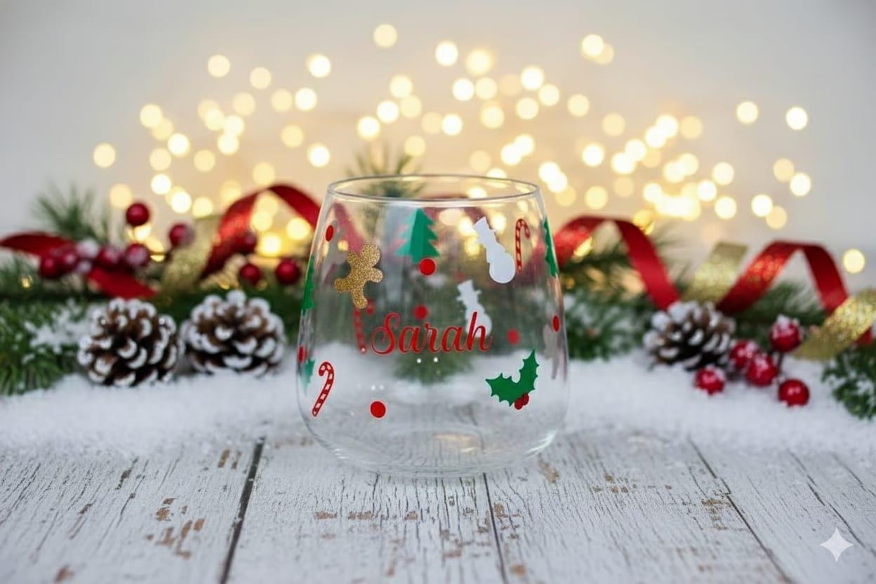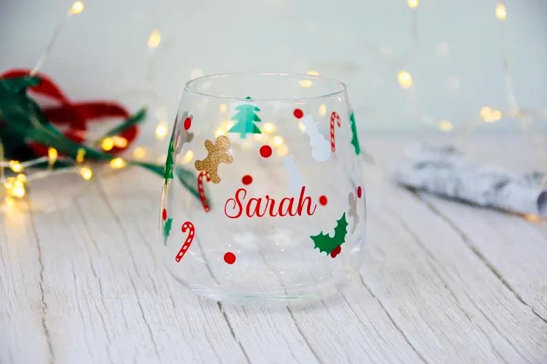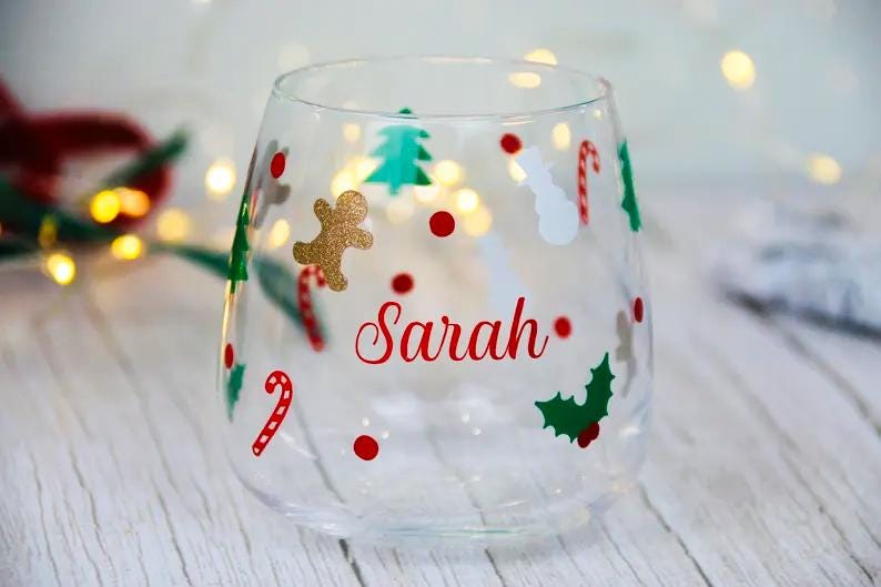 Celebrate the joy of Christmas with this beautifully personalised tumbler, perfect for sipping your favorite holiday drink in style! This glass is adorned with delightful festive icons, including candy canes, holly, snowmen, Christmas trees, and a touch of glitter with a golden gingerbread man. Each glass is customized with your chosen name in a vibrant red script, making it a wonderful gift for family, friends, or even yourself. Ideal for cozy nights in or holiday gatherings, this Christmas-themed glass adds a festive touch to any drink. Dishwasher safe, though handwashing is recommended to keep the design looking its best. Add a special, personal flair to your holiday celebrations!