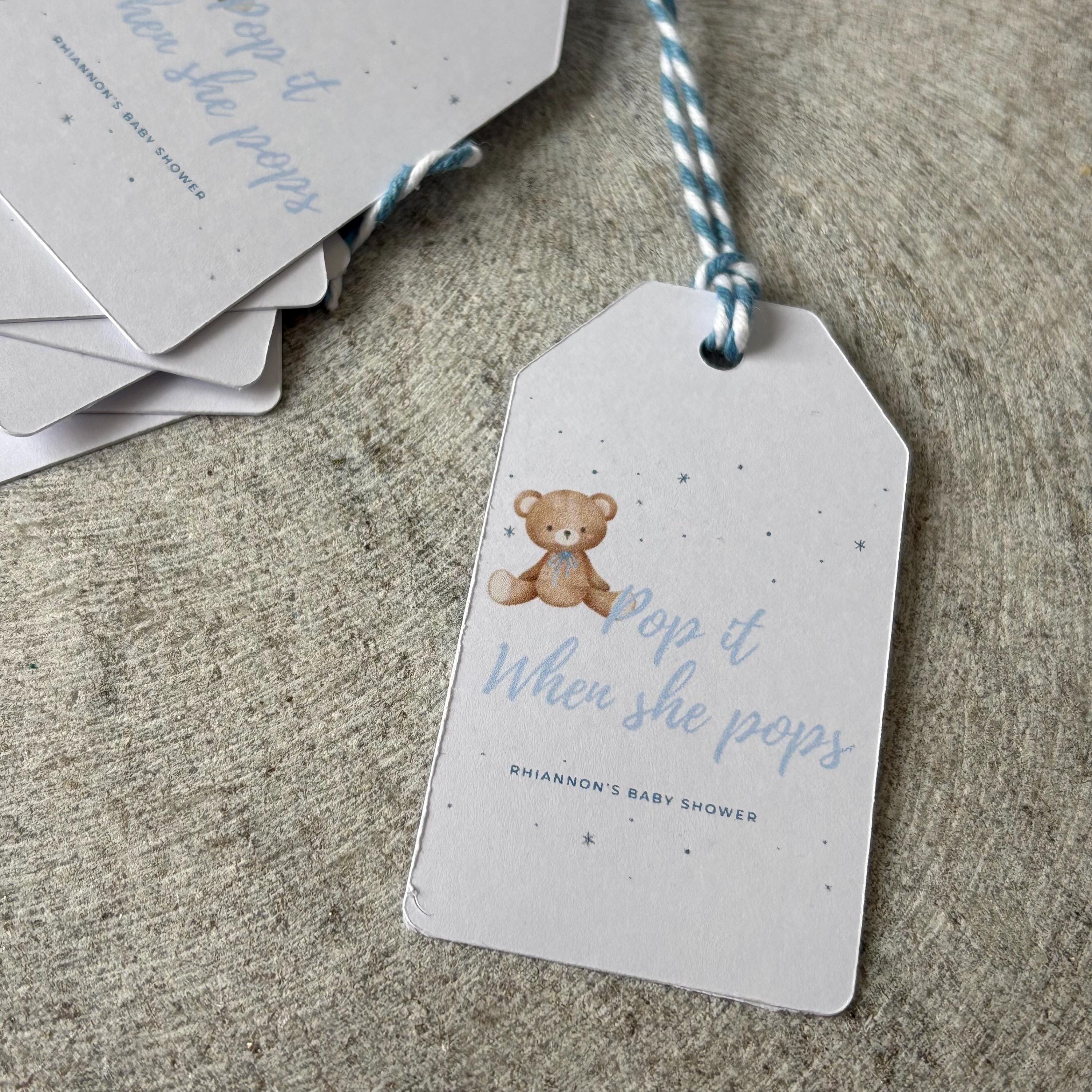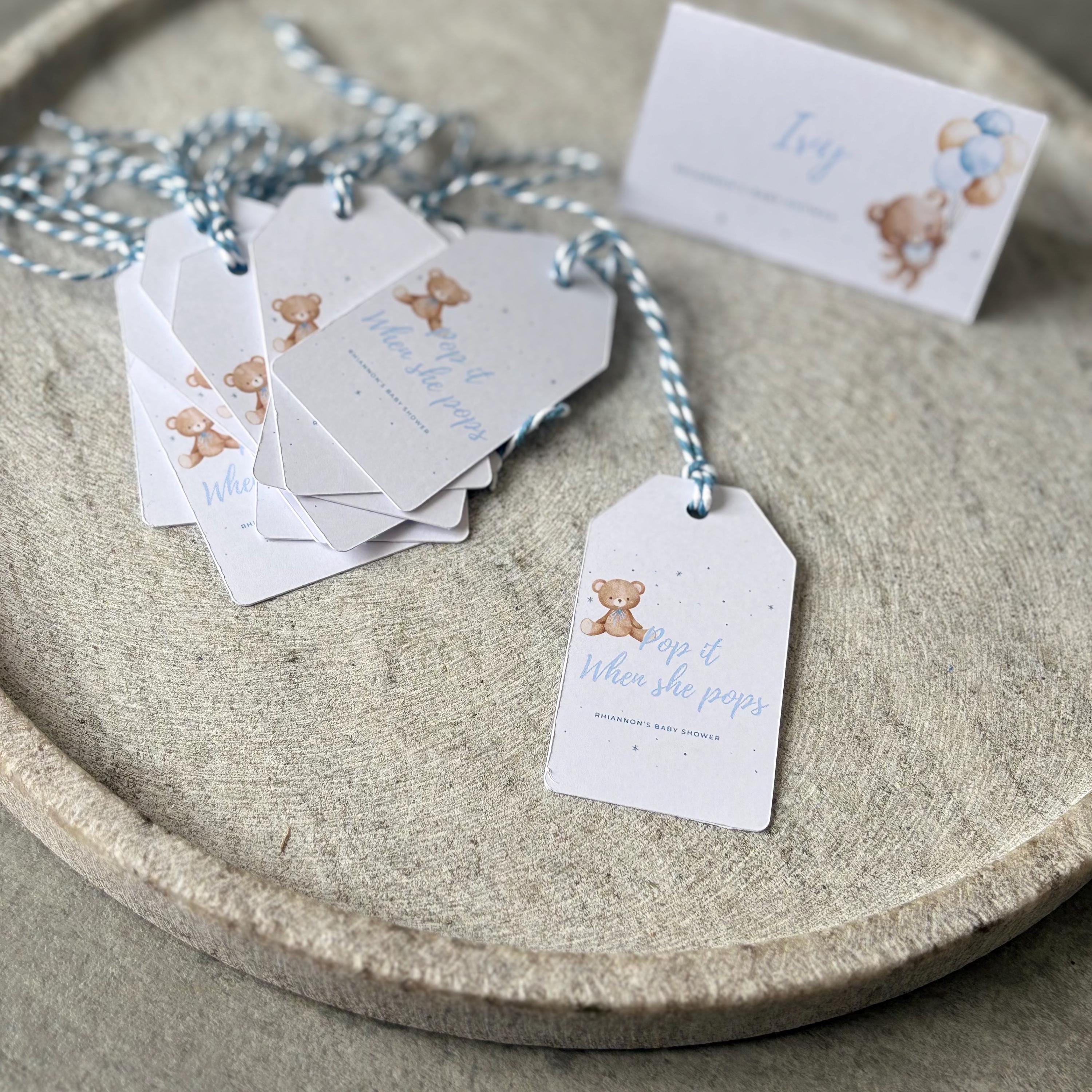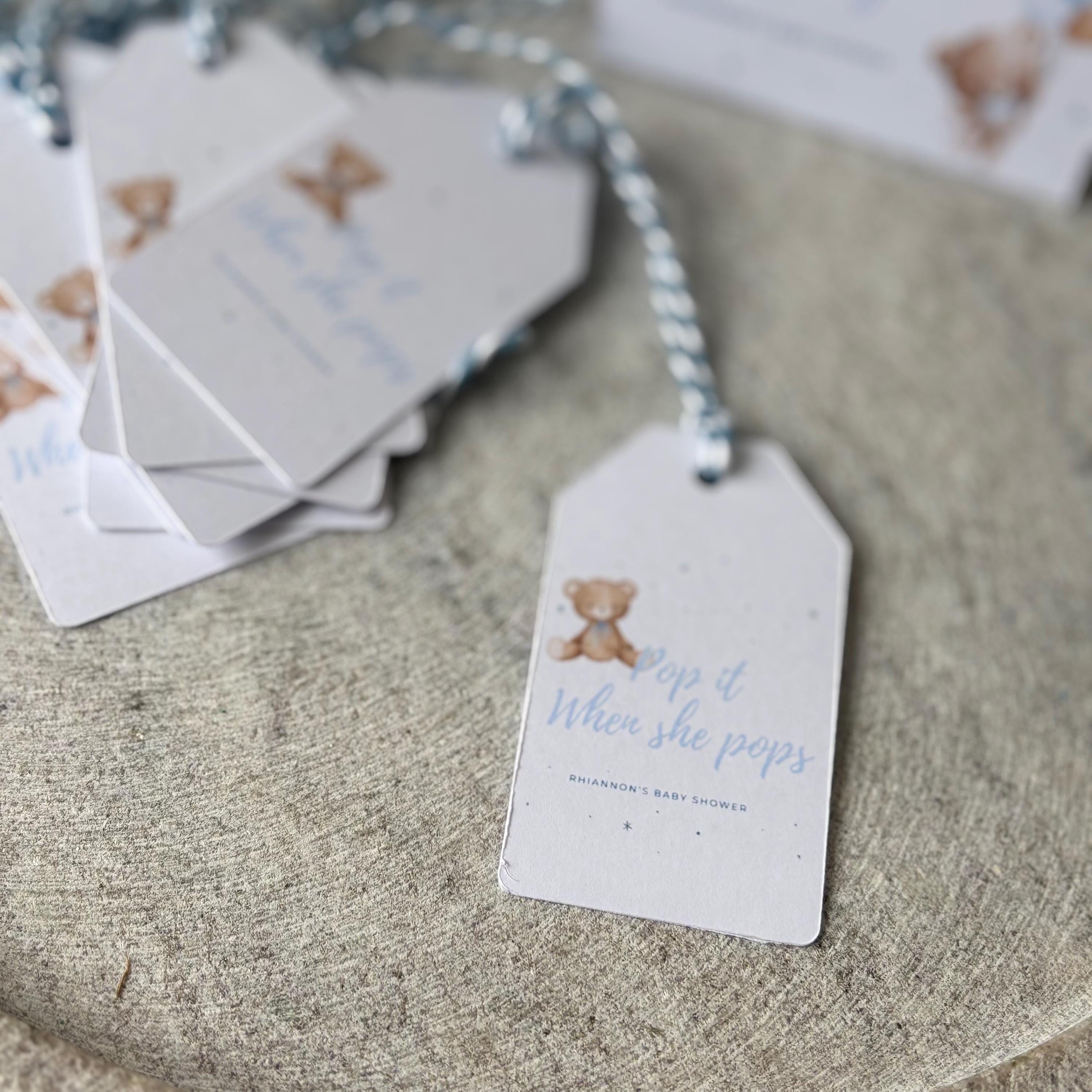 Each tag is lovingly crafted with a soft, neutral design featuring an adorable teddy illustration and the phrase “Pop it when she pops”, making them ideal for attaching to mini bottles of prosecco, champagne, or soft drinks as a thoughtful gift for your guests.