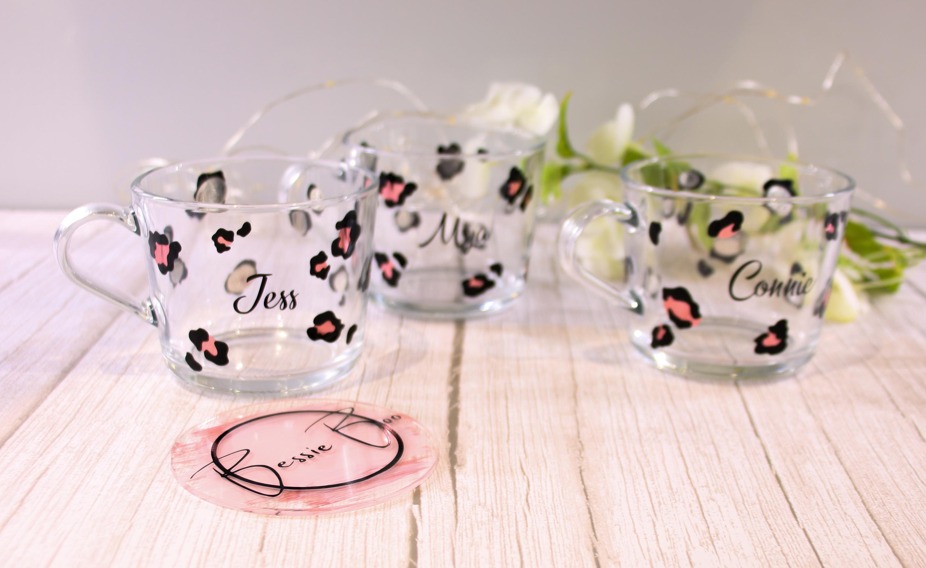 Add a touch of elegance and fun to your daily drinkware with our personalised leopard print glass mugs! Each cup is adorned with a stylish leopard print design featuring black, pink, and metallic silver accents, making it the perfect statement piece for your morning coffee or tea.